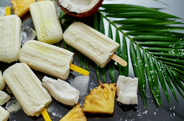 Jums reikės: 320 g šviežio ananaso, 1 vidutinio dydžio gerai sunokusio banano, 120 ml kokosų pieno kietosios dalies (kremo nuo kokosų pieno skardinės viršaus).