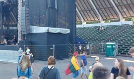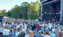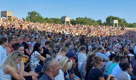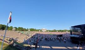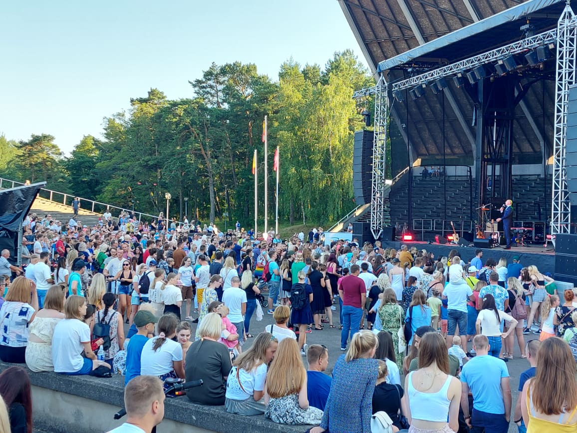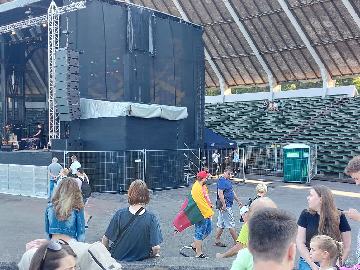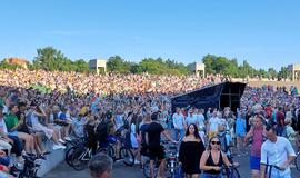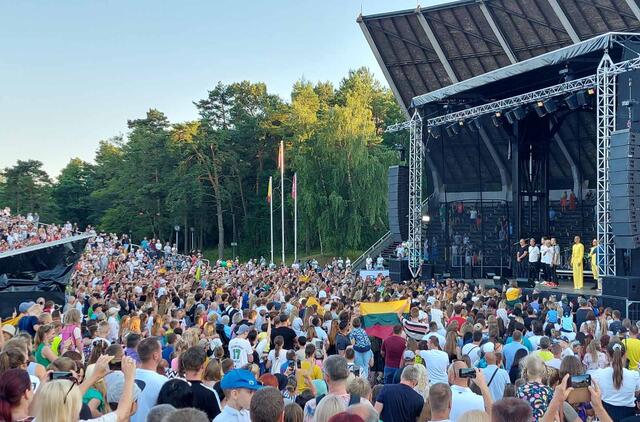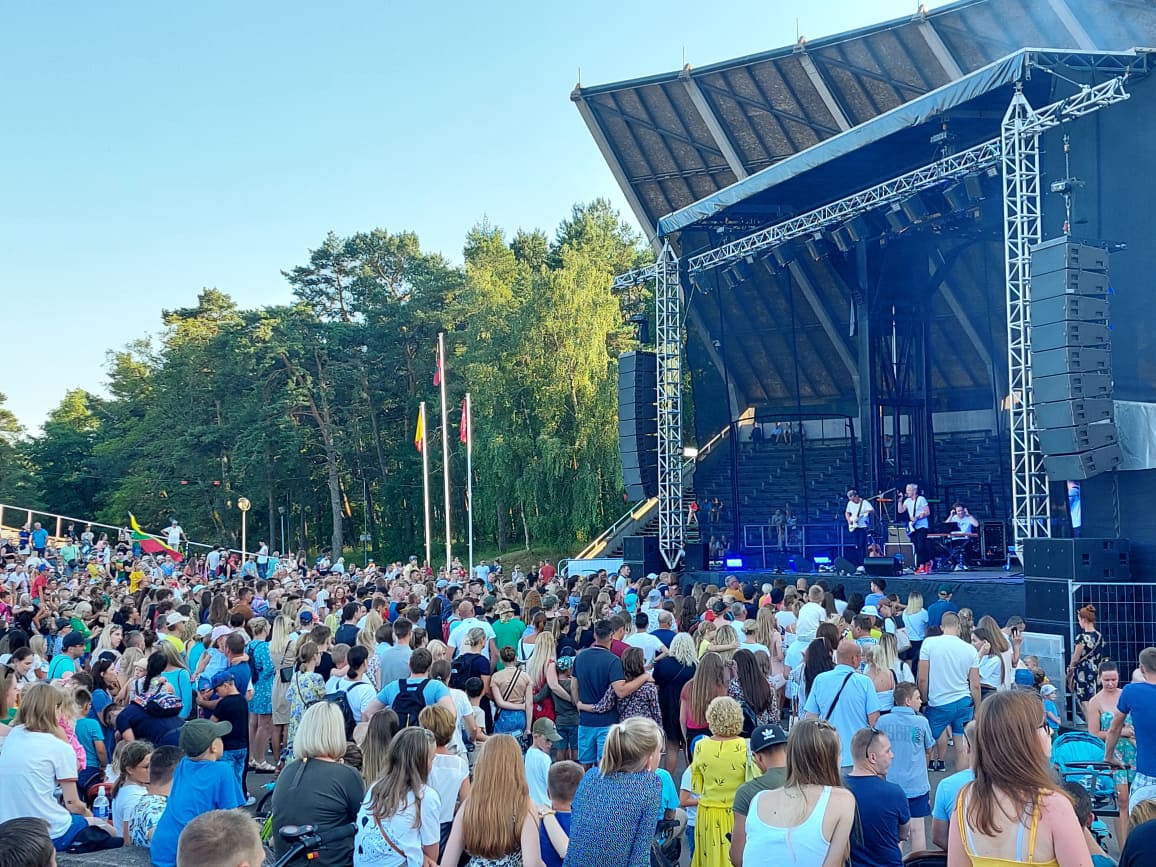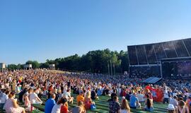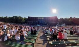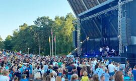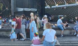 Vasaros estradoje laisvų sėdimų vietų - vos viena kita. Klaipėdiečiai valstybinę dieną švenčia pasipuošę Lietuvos trispalvių simbolika ar rankose plevėsuodami vėliavas.