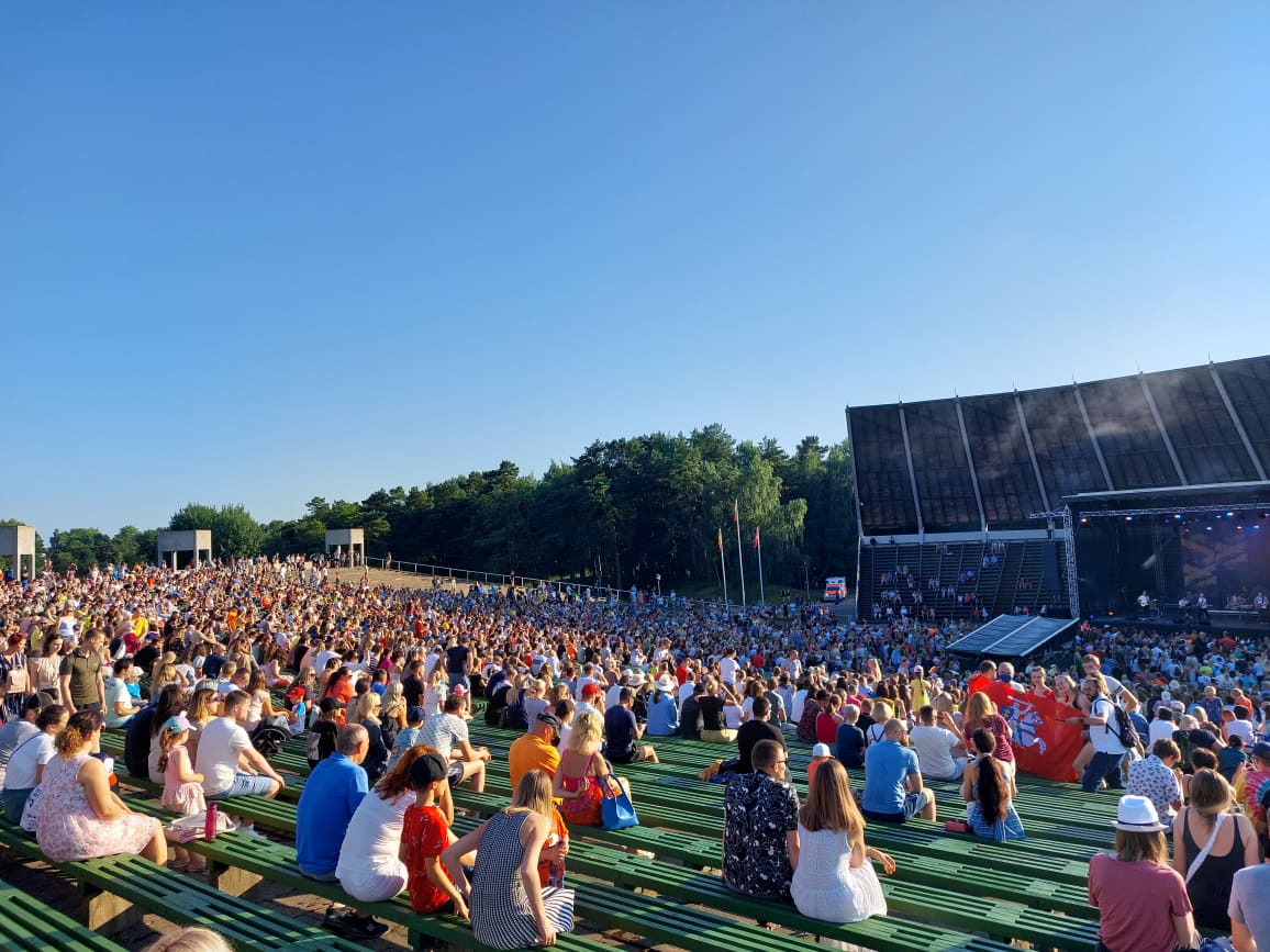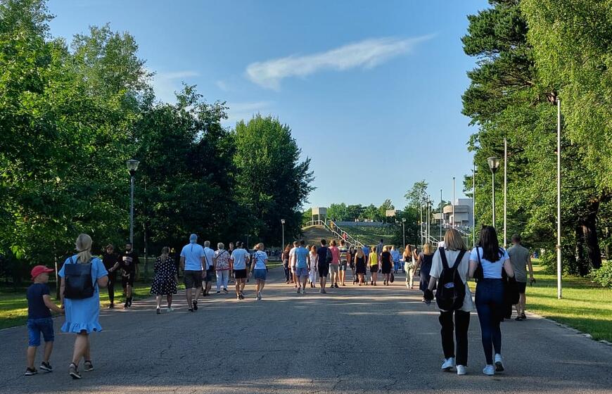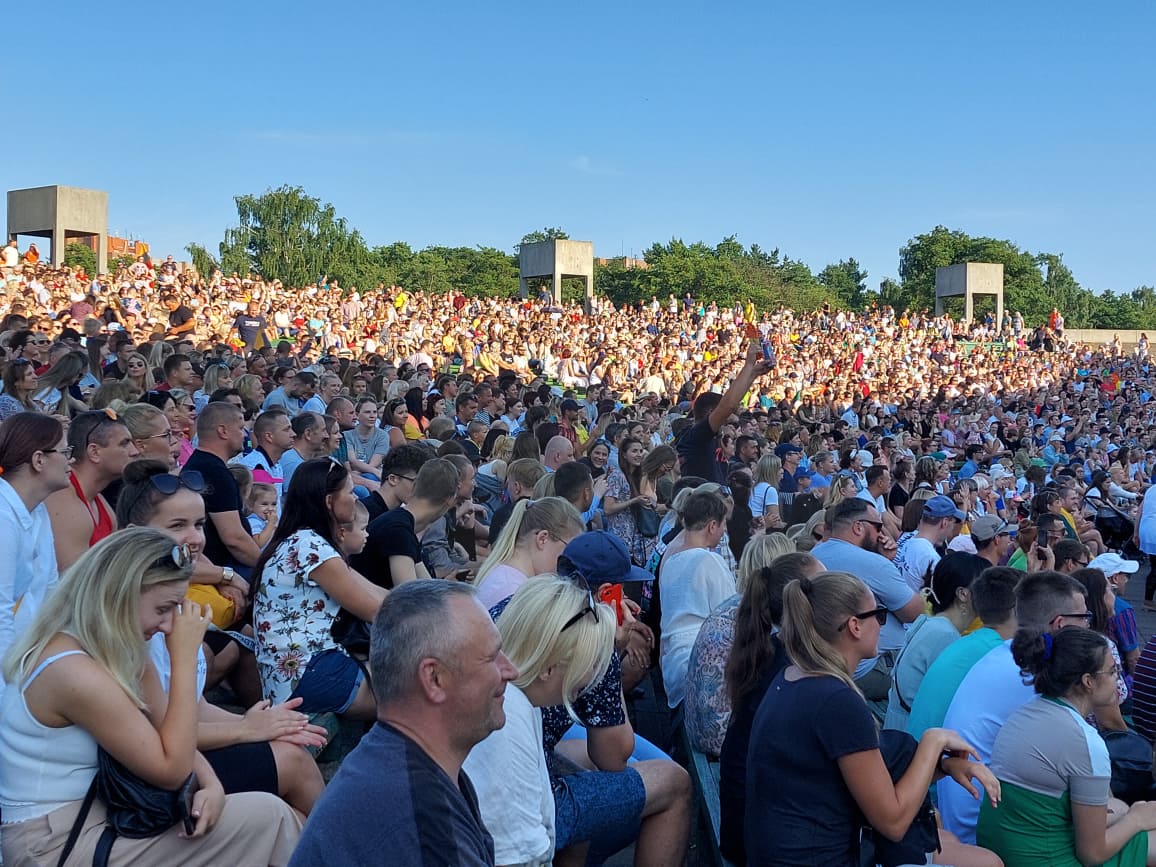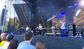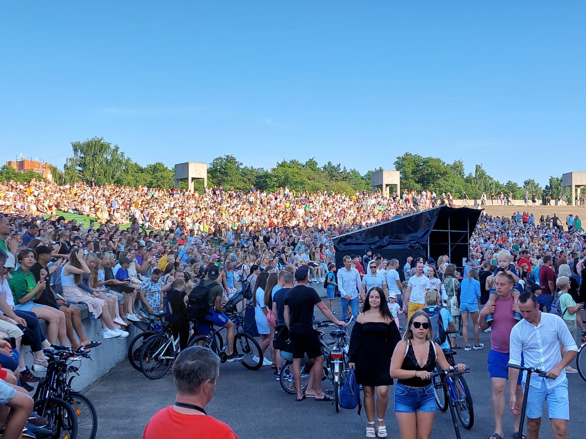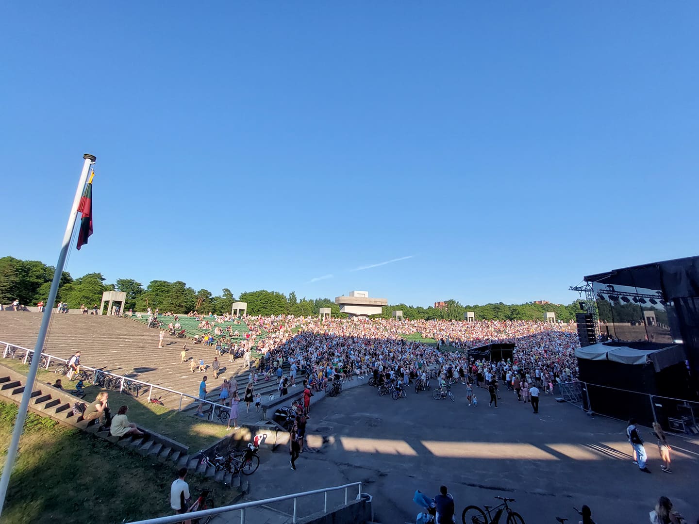Vasaros estradoje laisvų sėdimų vietų - vos viena kita. Klaipėdiečiai valstybinę dieną švenčia pasipuošę Lietuvos trispalvių simbolika ar rankose plevėsuodami vėliavas.