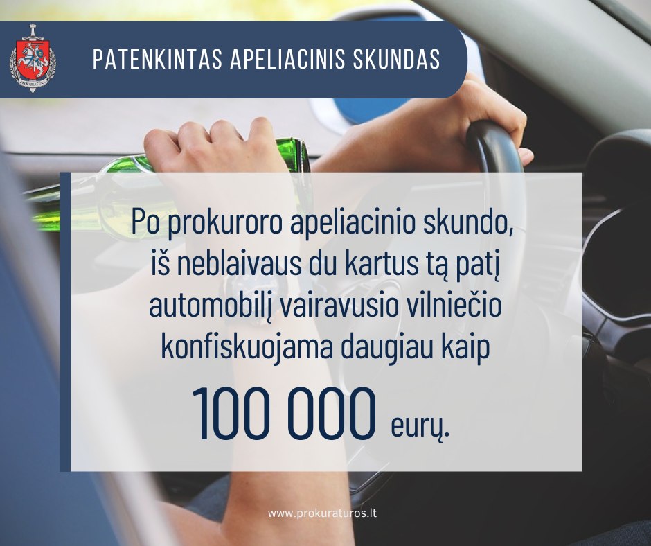 Apeliaciniame skunde prokuroras nurodė, kad A. D. tuo pačiu automobiliu padarė du tyčinius analogiškus nusikaltimus, todėl teismas turėjo konfiskuotiną sumą nustatyti dėl abiejų nusikaltimų padarymo.