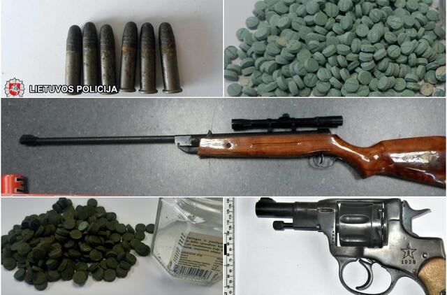 Atlikus kratą nurodyto asmens gyvenamojoje vietoje, rasti du dujiniai revolveriai, perdirbtas pistoletas, šaunamojo ginklo duslintuvas, virš 50 įvairaus kalibro šovinių, daugiau nei 550 tablečių su psichotropinėmis medžiagomis – metamfetaminu ir MDMA, neteisėti žvejybos įrankiai, keli litrai nedenatūruoto etilo alkoholio ir naminių stiprių alkoholinių gėrimų.