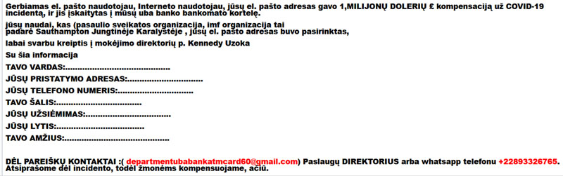 Todėl nenuostabu, kad kreipiamasi į „gerbiamą el. pašto ir interneto naudotoją“. Taip pat neaišku ir apie kokius dolerius kalbama. Šalia žodžio „dolerių“ yra ir Jungtinės Karalystės svarų sterlingų ženklas. O kompensacija „už COVID-19 incidentą įskaityta į mūsų uba banko bankomato kortelę“.