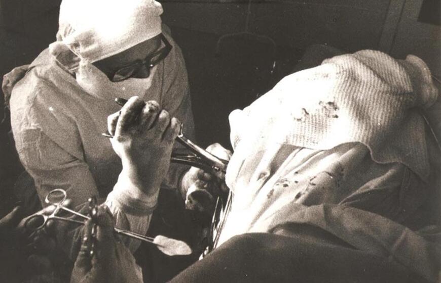 „Taip buvo operuojamas stuburas, nes nebuvo siurblių, irigatorių. Dabar operuojame ligoniui gulint ant pilvo, nes kraujas siurbiamas siurbliais, o tada kraujas bėgdavo į padėtą dubenį. Operacija užtrukdavo ir penkias valandas. Būdavo labai nepatogu sėdėti - pasilenkus, susirietus prie nepatogių operacinių stalų. Nuovargis didžiulis“, - prisiminė V. Grykšas rodydamas šią nuotrauką, kurioje užfiksuotas J. Pakutinskas operacijos metu.