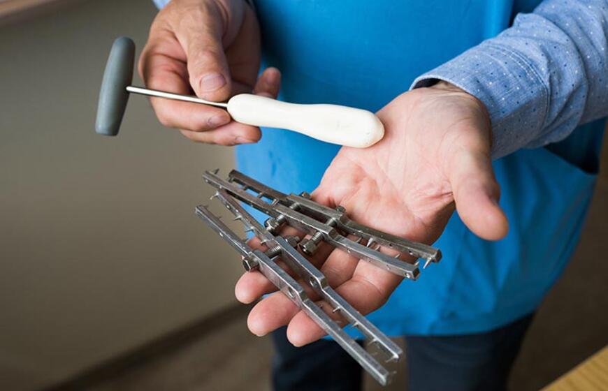 Vytautas Grykšas rodo išlikusius Jono Pakutinsko naudotus darbo įrankius.