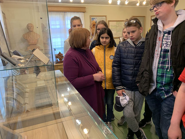 Pabendravę su mokiniais, apsilankę mokyklos bibliotekoje, kurioje įrengta vyskupo Motiejaus Valančiaus memorialinė ekspozicija, paklausę žemaitiškos kalbos, dainų bei pažaidę, išvykome į Vyskupo Motiejaus Valančiaus gimtinės muziejų.