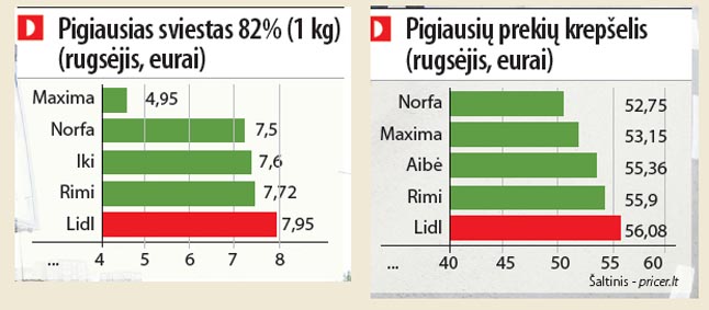 „Pricer.lt“ į pigiausių prekių krepšelį įtraukė 32 maisto prekes. Pigiausias krepšelis yra trijuose lietuviškuose prekybos tinkluose: tinkle „Norfa“ - 52,75 euro, „Maxima“ - 53,15 euro, „Aibė“ - 55,36 euro. Vokietijos tinklą, kurio krepšelio kaina yra 56,08 euro, lenkia ir „Rimi“ - 55,9 euro. Tad kur čia tas „Lidl“ išreklamuotas pigumas?