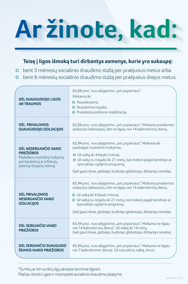 Primename, kad dirbančiajam susirgus, slaugant susirgusį vaiką iki 14 metų arba susirgusį šeimos narį, galioja įprasta nedarbingumo pažymėjimo išdavimo ir ligos išmokos mokėjimo tvarka, tačiau kreiptis dėl nedarbingumo į gydantį gydytoją ar šeimos gydytoją reikia nuotoliniu būdu.