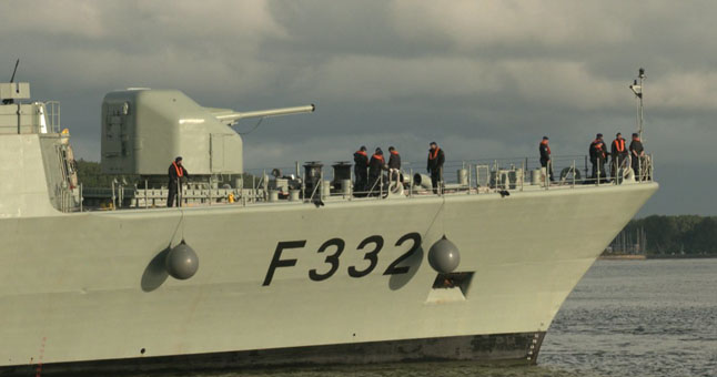 Klaipėdoje vieši du didžiuliai NATO karinių jūrų pajėgų laivai. Štai, pirmasis ruošiasi švartuotis ir apsisuka svečias iš Portugalijos. Laivas sveria per tris tūkstančius tonų, jo ilgis beveik pusantro šimto metrų. Net 59 kilometrų per valandą greitį išvystantis laivas ginkluotas iki dantų. Fregatos priekyje 100 milimetrų pabūklas, denyje įrengtos torpedų ir raketų paleidimo sistemos bei stambaus kalibro kulkosvaidžiai.