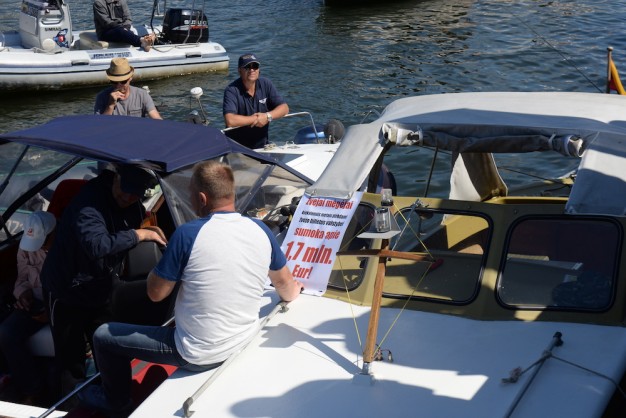 Beje, politikams žvejai įteikė po dovanėlę - po rūkytą sterką, kokį gali gaudyti ir rūkytą parduoti žvejai verslininkai, tačiau žvejai mėgėjai už tokio dydžio žuvį sumokėtų 450 Eur baudą.