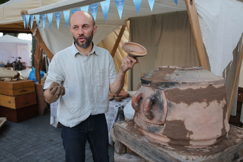 Iš Širvintų rajono atvykęs Gintaras ruošė lauko krosnelę, kurioje šventės metu keps tradicinę ruginę duoną. "Duonai iškepti reikia 300 laipsnių temperatūros krosnyje. Tad aplipdome moliu visus tarpelius, kad šiluma viduje kuo ilgiau išsilaikytų. Šitoje krosnyje telpa 5-6 maži pagrandukai ir tik vienas normalus 1-2 kg duonos kepalas. Kad duona taptų duona - procesas trunka tris dienas, iškepa kepalas per porą valandų, o valgyti ją skubėti nereikia. Mūsų proseneliai ragaudavo duoną tik po savaitės. Kuo šviežesnė duona - tuo skanesnė ir daugiau susivalgo. Tai beprasmis maisto eikvojimas. Duona turi būti skalsi", - teigė duonkepys.