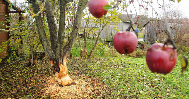 PER NAKTĮ. Štai taip bebrai per naktį sunaikino obelį. NAUJAKURIAI. Nuleidus Laukžemių-Eketės tvenkinio vandenį be namų likę bebrai užtvenkė per sodų bendriją "Eketė" tekėjusį upelį.