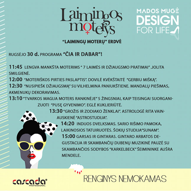 Kankina sprendimai, ką rengtis atšąlus orams, kaip prižiūrėti odą, kokias kosmetikos priemones naudoti, kaip atgaivinti aksesuarų kolekciją ar sukurti jaukumą namuose? Rugsėjo 30 dieną 11-16 val Klaipėdos ,,Švyturio’’ arenoje visi šie klausimai sulauks atsakymų. Daugiau nei šimtas mados ir grožio specialistų ne tik iš Lietuvos, bet ir iš Latvijos atvyks į išskirtinę mados mugę ,,Design for life’’. Naujausios drabužių kolekcijos, stilingiausi papuošalai, kosmetikos priemonės ir visa galybė specialių veiklų bei užimtumo programų, o kur dar nuolaidos ir dovanos – visa tai suburs paskutinis rugsėjo šeštadienis.