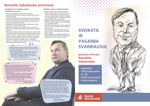 Taip, mieli rinkėjai, esate teisūs - kalbu apie Respublikinę Klaipėdos ligoninę, kurios šiandieninės galimybės padėti ligoniams yra itin didelės. Kuri pasipuošė naujais priestatais, kuri šiuolaikiška ir jauki. Ir tai yra didelis Romaldo Sakalausko nuopelnas. Juk ne veltui jis buvo nominuotas Garbės klaipėdiečio vardui gauti. Su juo man teko dirbti ranka rankon, kad Lietuvos sveikatos apsaugos sistemoje būtų diegiama vis daugiau pažangių gydymo būdų. Juo teko pasitikėti ir darant sunkius sprendimas. Tad pats laikas išbandė Romaldą, suteikdamas jam galimybę patikrinti save įtemptame chirurgo ir ligoninės vadovo darbe. Ir jis įrodė, kad jo nuveikti darbai jau tapo Klaipėdos miesto istorijos dalimi. Tad džiaugiuosi galėdamas Lietuvos ir Klaipėdos rinkėjams pasakyti, jog šis darbų užgrūdintas žmogus - puikus Jūsų pasirinkimas. Linkiu Romaldui sėkmės, o mums visiems - darbštaus ir atkaklaus naujo Seimo nario.