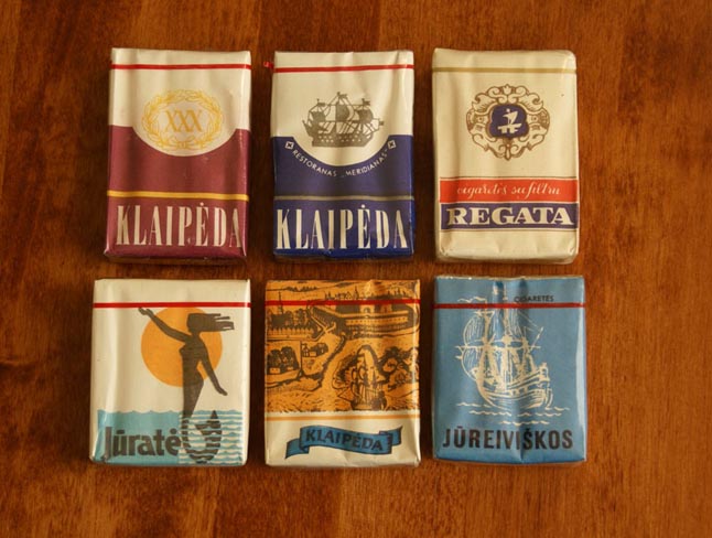 Dabar labai įdomu pasižiūrėti į fabriko pirmosios "sulietuvintos" produkcijos - cigarečių - pakelius, kuriuos yra surinkęs mažeikiškis Vytautas Strikauskas. Pakelių dizainui stengtasi "pripaišyti" grynai klaipėdietiškus motyvus: "Jūreiviškos", "Klaipėda", "Švyturys", "Jūratė". Pirmosios lietuviškais pavadinimais dar buvo be filtrų. Ir kaip džiūgavo rūkaliai, kai pradėtos gaminti cigaretės ir su filtrais. Atrodo, kad pirmosios su baltais filtrais buvo cigaretės "Jūratė". Vėliau radosi ir "Kastyčio" cigarečių prekinis ženklas. Labiausiai nustebinęs V. Strikausko cigarečių pakelių kolekcijos eksponatas - uostamiesčio Tabako fabrike pagamintos "Už sąjūdį, už Lietuvą".