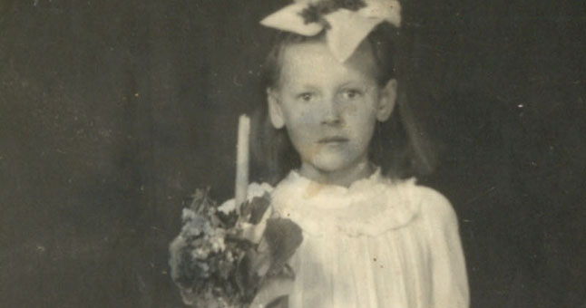 PIRMOJI KOMUNIJA. Kitoje šios nuotraukos pusėje Aldutė Petrauskaitė savo vyresniajai sesei Zitai 1954 m. kovo 17 d. užrašė: "Nors toli aš būsiu ir skausmus kentėsiu, bet tavęs, sesute, pamiršt negalėsiu."