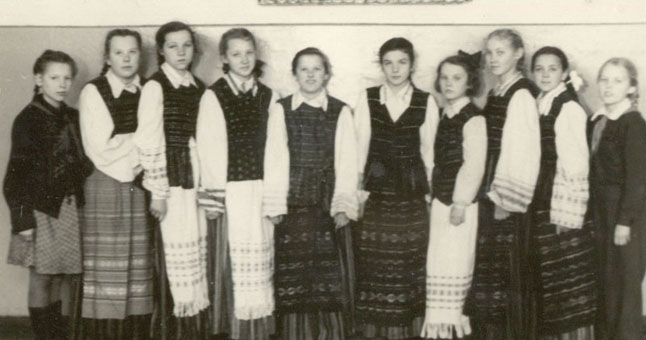 ŠOKĖJĖLĖ. "Buvau prie "tanciaus" ir prie rožančiaus", - šiandien savo jaunystės dienas mena Aldona Petrauskaitė-Linaburgienė (pirma iš kairės, savo tautinius drabužius buvo paskolinusi kitai šokėjėlei).