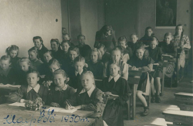 PAMOKOSE. Nors mokyklinės uniformos buvo privalomos, tačiau pasitaikydavo ir išimčių. Šioje nuotraukoje A. Grigaitė vilki šviesią suknelę.