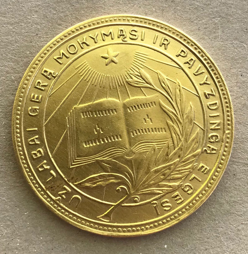 AUKSO MEDALIS. Taip atrodė aukso medalis, 1945 m. įteiktas gimnazistei Emilijai Kėdainių gimnazijoje.