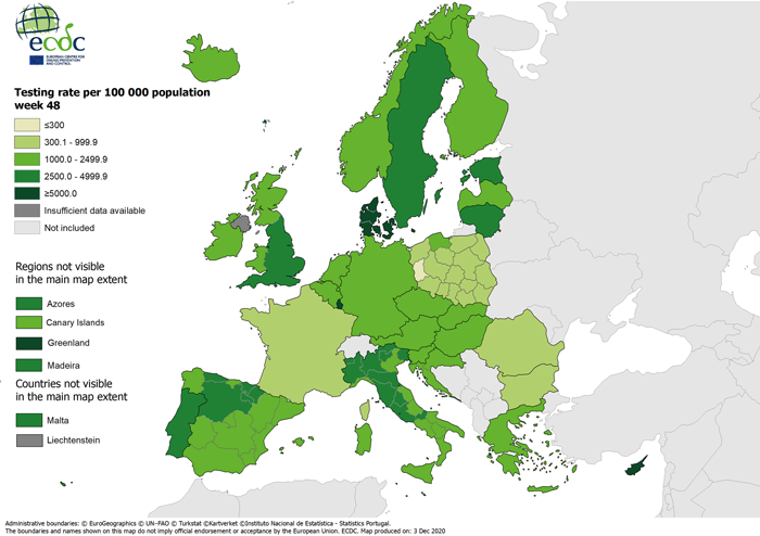Remiantis duomenimis, kuriuos ECDC surinko iš oficialių nacionalinių šaltinių 31 Europos šalyje lapkričio 23-29 d., testavimo nuo koronaviruso apimtys išliko didžiausios Liuksemburge (12,9 ištestuoti žmonės 100 tūkst. gyventojų) Kipre (9,1) ir Danijoje (8,7). Lietuva pagal testavimo rodiklį (2,9 ištestuoti žmonės 100 tūkst. gyventojų) buvo šeštoje vietoje ir lenkė kitas Baltijos valstybes. Estija liko septintoje vietoje (2,7 ištestuoti žmonės 100 tūkst. gyventojų), Latvija – 10 vietoje (2,4),