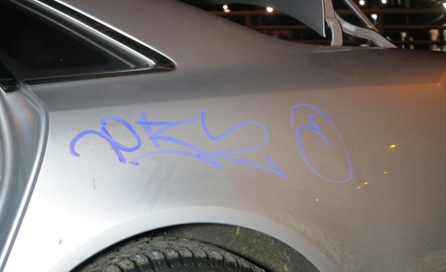 "Audi" kairė pusė ir vairuotojo durų stiklas buvo išmarginti nevykusiais piešiniais, veikiausiai pasidarbavo chuliganai.