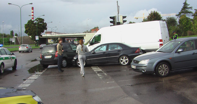 Liepų gatvę iš šalutinės Artojų gatvės bandęs kirsti "Mercedes benz C270" vairuotojas nepastebėjo pagrindiniu keliu važiavusio moters vairuojamo automobilio "Mercedes Benz A-170" ir trenkėsi į jį.