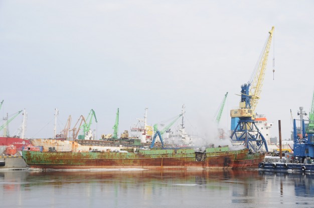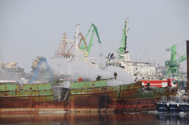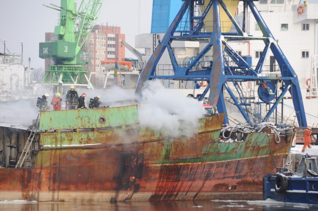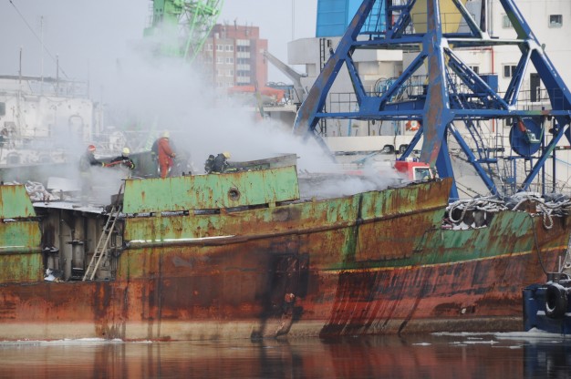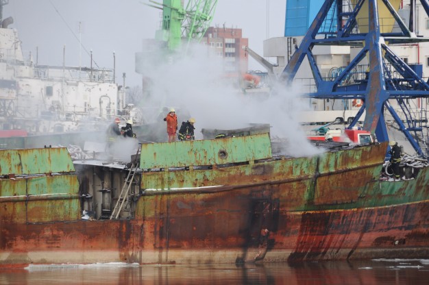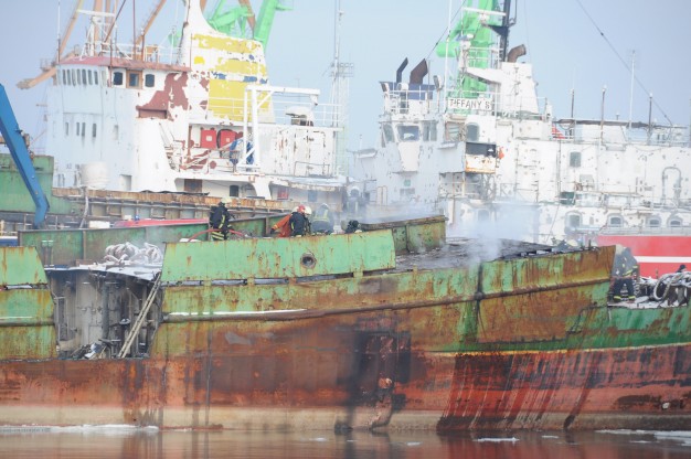 Pasirodė, kad į metalo laužą pjaustomame laive užsiliepsnojo apšiltinimo medžiagos.
