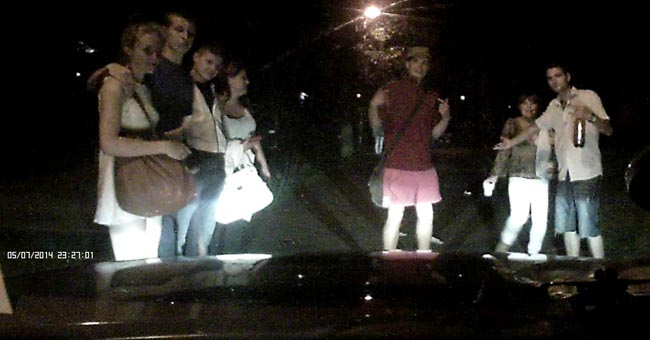 Anot jo, akivaizdžiai neblaivūs vaikinai ir merginos nenorėjo klausytis prašymų pasitraukti nuo tako, o iš automobilio išlipusį vairuotoją kompanija užpuolė, sumušė, o vėliau, man bandant pasprukti apgadino visą automobilį - jį spardė kojomis, daužė tuščiais buteliais ir akmenimis.
