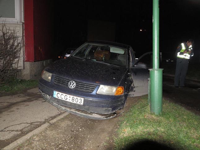 Prie automobilio pirmieji suskubo ugniagesiai-gelbėtojai. Nurodytoje vietoje, šalia namo, prie stulpo ant šaligatvio rastas automobilis "VW Passat" su trimis ratais.