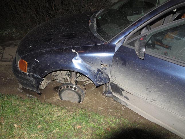 Šalia vaikščiojo šlepetėmis apsiavęs, neblaivus automobilio savininkas Tomas K., gim. 1979 m., ir teigė, kad šitaip automobilis, be vieno rato, ant šaligatvio stovi nuo praėjusio šeštadienio. Tai yra savaitę.