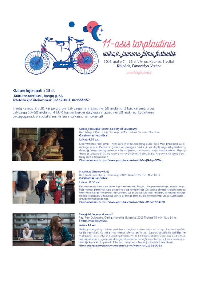 Kaip ir kiekvieną rudenį, spalio 7–16 d. Lietuvos didieji ekranai eterį užleis Tarptautiniam vaikų ir jaunimo filmų festivaliui. Šiemet konkursinės programos filmai iš Izraelio, Brazilijos, Prancūzijos, Estijos, Nyderlandų, Belgijos, Čekijos ir Rusijos kvies moksleivius pasitikrinti savo ribas, o specialią vaikų ir jaunimo žiuri – rinkti labiausiai patikusius filmus.