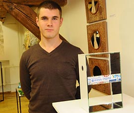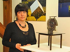 Kretingiškė stiklo plastikos ir vitražo meistrė Dalia Skridailaitė parodoje eksponuoja moliravimo technika atliktą darbą "Filosofas".