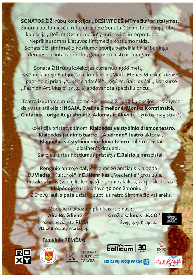Žinoma rūbų dizainerė Sonata Žiži pristato kolekciją „Dešimt dešimtmečių“, skirtą paminėti Lietuvos šimtmečiui. „Prieš kelis metus šventėme Lietuvos tūkstantmetį. Tai didžiulis laikotarpis, apie jį žinome iš rašytinių šaltinių, pasakų, legendų. O štai šimtmetis susijęs su kiekvienu iš mūsų“, - apie kolekciją kalbėjo uostamiesčio menininkė.
