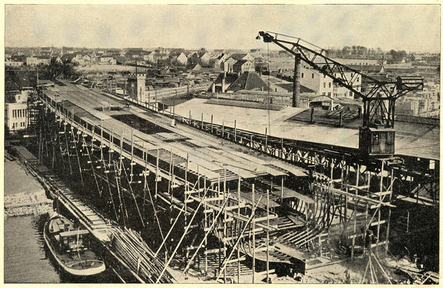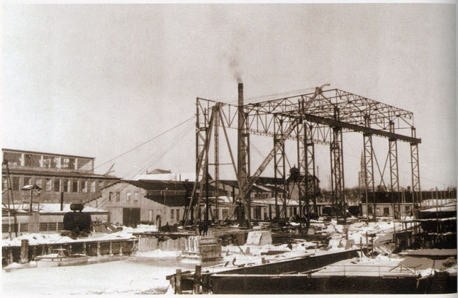 Ketvirtojo dešimtmečio viduryje, išaugus naujų laivų paklausai tarptautinėje rinkoje, P. Lindenau laivų statykloje imtasi plėtros. Iš pradžių įsigytas plaukiojantis dokas, galiausiai iš marių atkovotoje, naujai supiltos sausumos teritorijoje įrengtas laivų statybos elingas su kranu. Tačiau nėra tiksliai žinoma, kuriais būtent metais jis iškilo ir ar buvo planuota jo metalinę konstrukciją uždengti stogu. Viena aišku – pirmajam savininkui elingas tarnavo neilgai.