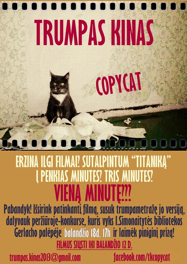 Klaipėdos universiteto studentai antrus metus iš eilės kviečia jaunimą kurti trumpametražius filmus ir dalyvauti konkurse “Trumpas Kinas. Copycat”. 2012m. konkursas "Trumpas Kinas" sulaukė studentų susidomėjimo, o šiais metais kviečiami ne tik studentai, tačiau ir 9-12 klasių mokiniai. Šiemet konkurso pavadinime atsirado žodelis “Copycat”, reiškiantis pamėgdžiojimą ir kopijavimą.