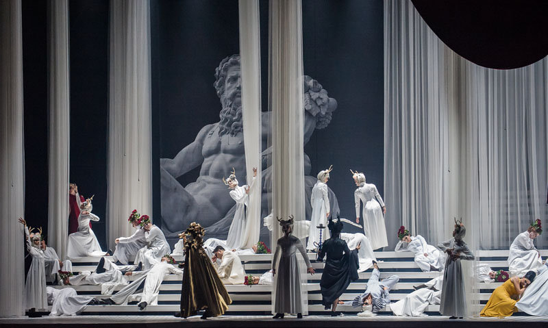 Įsijausti į operetėje autoriaus užkoduotą ironišką idėją, solistams padėjo išradinga scenografija: laiptai, tarsi ryšys tarp dangaus ir pragaro, puošnūs salonai – deivių buveinės; apgalvota kostiumų (moterų ir vyrų) spalvinė gama, veidus dengiantis, kaukes imituojantis grimas, efektingas, pateisintas, prasmingas šviesų naudojimas ir kt.