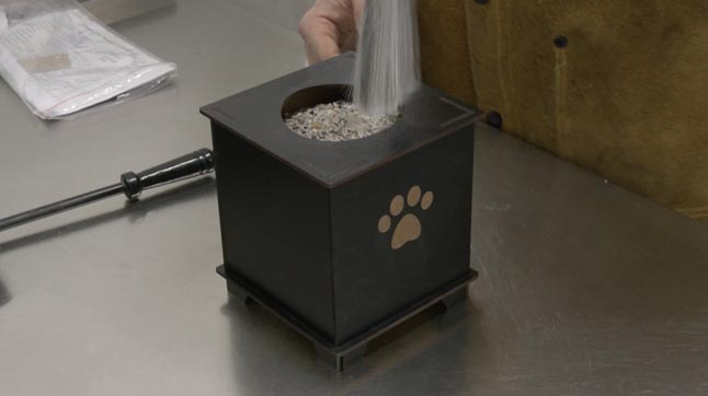 Kol šeimininkas rašo prisiminimą, visi gyvūno pelenai atgula į urną. Standartinę urną, įvairių dydžių, darbuotojai dovanoja, o jei augintinio savininkas nori kitokios – pasiūlymų gausu. Kainos svyruoja nuo 30 iki 100 eurų. Brangiausia yra katės formos urna. Dalis urnų – lietuvių rankų darbo.