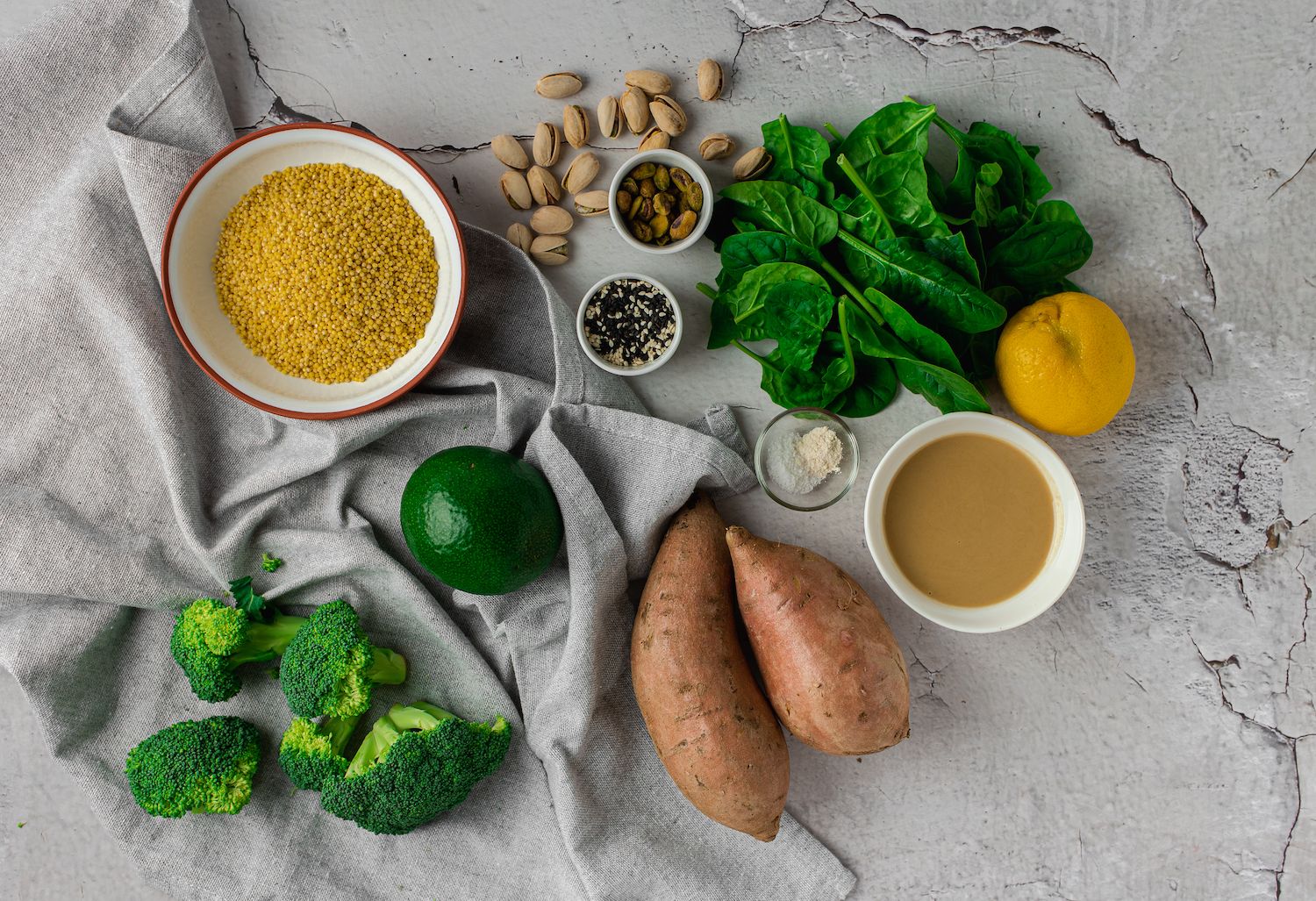 6. Ingredientus sudedame į dubenėlius: špinatai, kruopos, brokoliai, avokadas, bulvės.