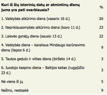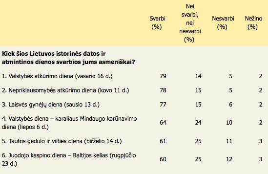 Mūsų šalies gyventojai gerbia ir vertina savo šalies istoriją ir jai nusipelniusius žmones. Naujienų agentūros ELTA užsakymu rinkos ir viešosios nuomonės tyrimų kompanijos "Baltijos tyrimai" sausio 23-31 dienomis atliktos apklausos duomenimis, kaip svarbias jiems asmeniškai (aštuoniems iš dešimties respondentų) išskyrė tris istorines datas - Valstybės atkūrimo dieną (Vasario 16-ąją), Nepriklausomybės atkūrimo dieną (Kovo 11-ąją) bei Laisvės gynėjų dieną (Sausio 13-ąją).Vasario 16-oji - Valstybės atkūrimo diena - ketvirtadaliui (26 proc.) 15 metų ir vyresnių šalies gyventojų yra pati svarbiausia iš minimų mūsų šaliai reikšmingų istorinių datų. Kad ši istorinė data yra svarbi jiems asmeniškai, nurodė aštuoni iš dešimties (79 proc.) apklaustų šalies gyventojų (38 proc. labai svarbi ir 41 proc. greičiau svarbi), septintadaliui (14 proc.) vasario 16 d. nei svarbi, nei nesvarbi ir tik vienas iš dvidešimties (5 proc.) respondentų atsakė, kad ši šventė jiems nėra svarbi (2 proc. nurodė, kad visiškai nesvarbi ir 3 proc. kad greičiau nesvarbi).