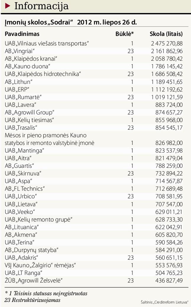 Informaciją apie Lietuvos įmones kaupiančios bendrovės „Creditreform Lietuva“ duomenimis, darbdavių skolos „Sodrai“ nuo 2011 m. liepos 23 d. iki šių metų liepos 23-iosios sumažėjo 4,25 proc., iki 212 mln. litų. O vakar, liepos 26-ąją, ši suma buvo dar šiek tiek mažesnė - 195,7 mln. litų.