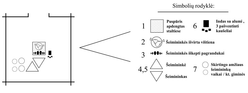 Mato Pretorijaus aprašytos grūdų šventės vizualizacija (kairėje), simbolių rodyklė (dešinėje).