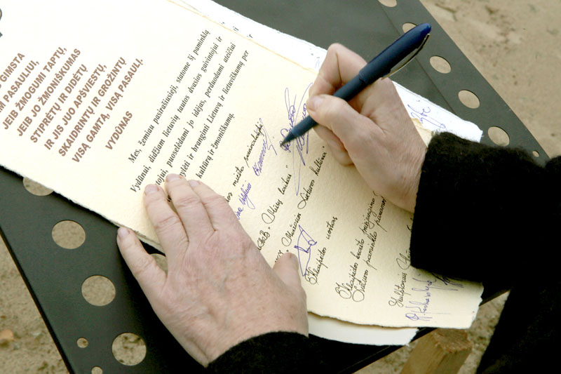 Visi jie pasirašė raštą, įdėtą į kapsulę su priesaika: "Mes, žemiau pasirašiusieji, statome šį paminklą Vydūnui, didžiam lietuvių tautos dvasios gaivintojui ir žadintojui, puoselėdami jo idėjas, perduodami ateičiai priesaką mylėti ir branginti Lietuvą ir lietuviškumą per mūsų kalbą, kultūrą ir žmogiškumą".