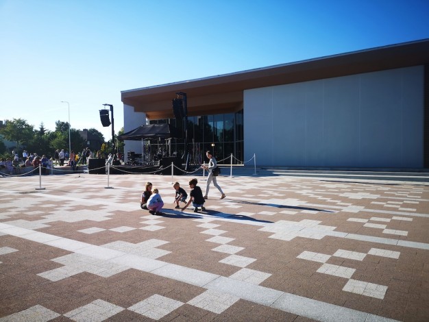 Dalyje aikštės, už scenos, palikta vietos ir automobiliams statyti.