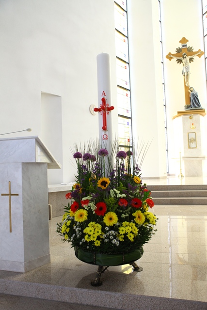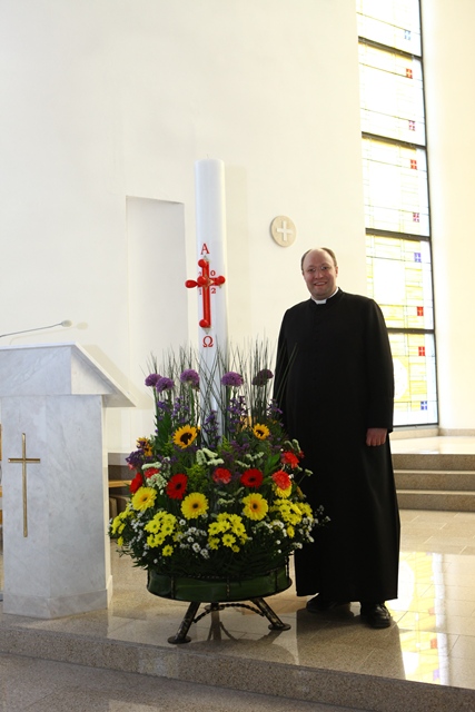 Klebonas dėkoja žvakę nuliejusiai įmonei "Luxa" ir jos atstovui Dainiui Petkui. Žvakę dailiai papuošė gėlėmis Danutė Sabalionienė.