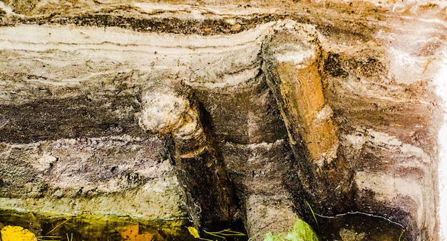 RADINYS. Archeologų aptikta sienos konstrukcija iš dviejų polių ir rąsto tarp jų.