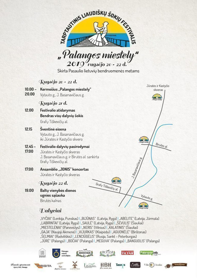 Šeštadienį, Jūratės ir Kastyčio skvere, festivalį "Palangos miestely" pradės šventės sumanytojai - Palangos kultūros ir jaunimo centro vyresniųjų liaudiškų šokių grupė "Banguolis" ir pagyvenusiųjų liaudiškų šokių ansamblis "Bočiai". Sekmadienį veiksmas persikels ant Birutės kalno.