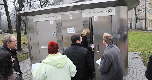 Miesto ūko tvarkymo skyriaus vedėja prielankumą rodo automatiniams tualetams. Nepaisant to, kad tokio vienviečio tualeto kaina prilygsta kelių kambarių buto kainai - esą paskui jį prižiūrint kur kas mažiau problemų.
