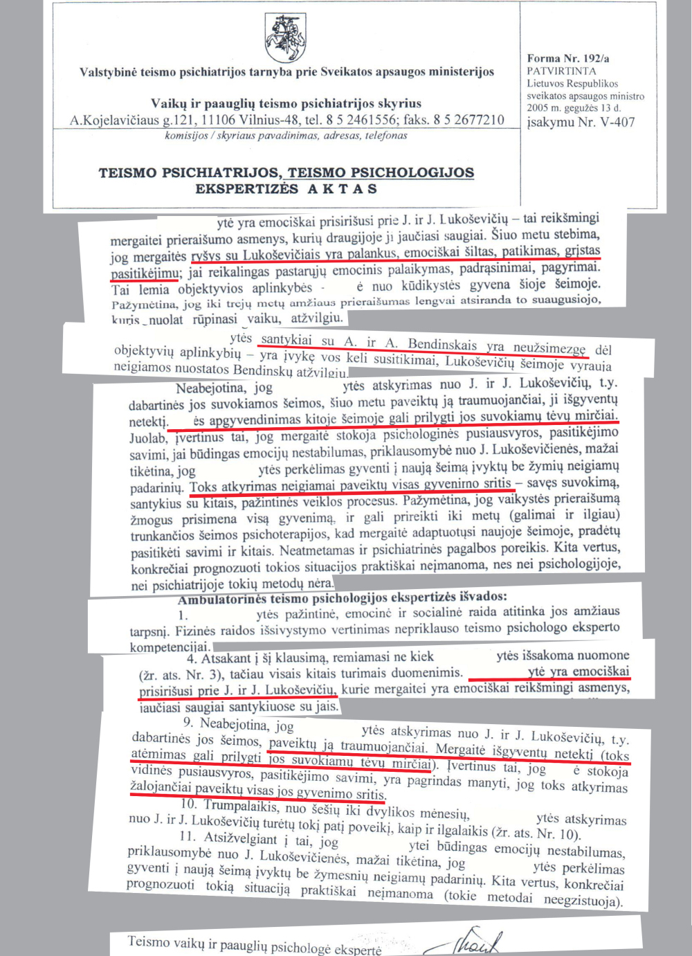 Visgi lieka neaišku, kaip BENDRAI susidariusią situaciją vertina Valstybinės teismo psichiatrijos tarnybos specialistai. Ekspertizės akte konstatuojama: „mergaitės ryšys su Lukoševičiais yra palankus, emociškai šiltas, patikimas, grįstas pasitikėjimu“, ji yra „emociškai prisirišusi prie J. Ir J. Lukoševičių, kurie mergaitei yra emociškai reikšmingi, ji jaučiasi saugiai santykiuose su jais“, „santykiai su A. ir A. Bendinskais yra neužsimezgę“, mergaitės atskyrimas „žalojančiai paveiktų visas gyvenimo sritis“, „paveiktų ją traumuojančiai“, „apgyvendinimas kitoje šeimoje gali prilygti jos suvokiamų tėvų mirčiai“, „KONKREČIAI prognozuoti tokios situacijos praktiškai neįmanoma, nes nei psichologijoje, nei psichiatrijoje tokių metodų nėra“.