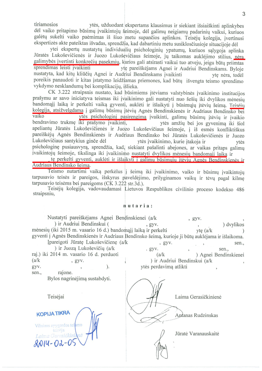 Anot Teismo, kadangi sunku nustatyti KONKREČIAS pasekmes, kokias sukeltų vaiko atskyrimas nuo jos dabartinių globėjų Lukoševičių, šis laikotarpis turėtų „pašalinti abejones, ar vaikas pritaps galimų įvaikintojų šeimoje“. Jis, žinoma, atsižvelgė į visas byloje esančias aplinkybes, ekspertų išvadas, vaiko psichologinį pasirengimą, vadovavosi įstatymais ir išimtinai vaiko interesais. Tiesiogiai išklausyti šešiametės nuomonės šiuo klausimu Teismas nematė jokios būtinybės.