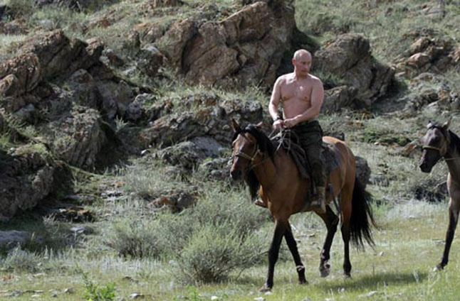Šį kartą nuotraukose V. Putinas įamžintas ne sėdintis ant arklio apnuoginta krūtine ar žvejojantis, kaip anksčiau.