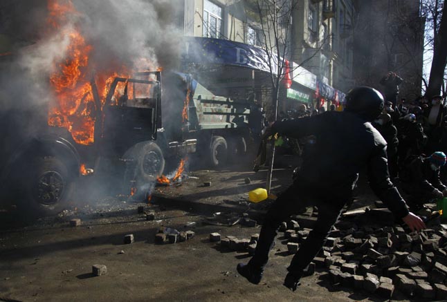 Ukrainos sostinės Kijevo Nepriklausomybės aikštėje tęsiasi susirinkusių protestuotojų stovyklos šturmas. Ukrainos sveikatos apsaugos ministerijos duomenimis, per susirėmimus Kijeve žuvo 25 žmonės. Tarp aukų yra 9 policijos pareigūnai. BBC duomenimis, per riaušes nukentėjo 241 žmogus, įskaitant 79 policininkus ir 5 žurnalistus.